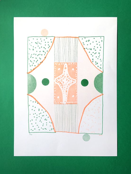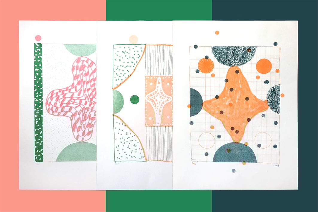 All three in the series of 2 colour prints playing with composition and testing the reproduction of collaged and drawn elements through the Risograph process.