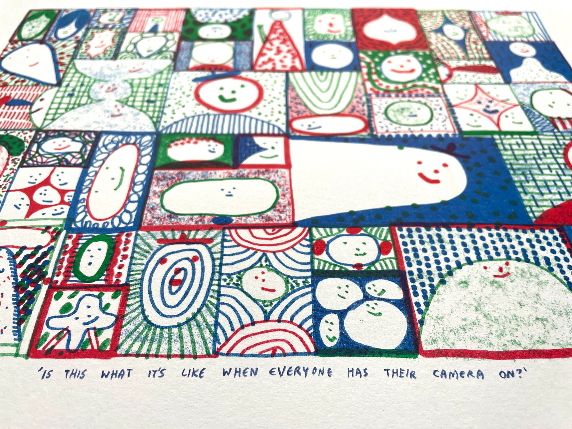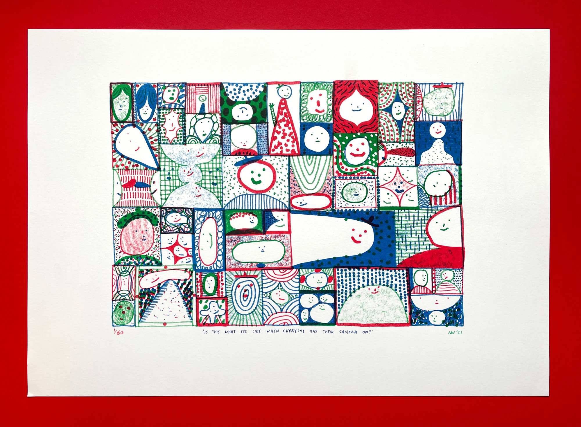 Based on a doodle from when I was teaching online during Lockdown 3.0 ‘Is this what it’s like when everyone has their camera on?’ is a work of fiction, as this never happened. Also, my students don’t just look like heads either floating or perched on top of another shape, about to roll off. I don't think.