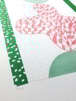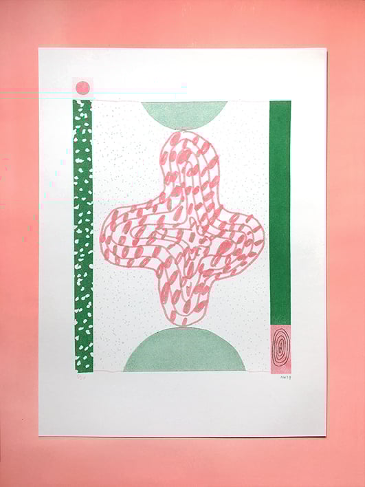 This on that (Pink and Green) is 1 of 3 new 2 colour prints playing with composition and testing the reproduction of collaged and drawn elements through the Risograph process. (i.e. the pink is created by printing Red at half tone.)