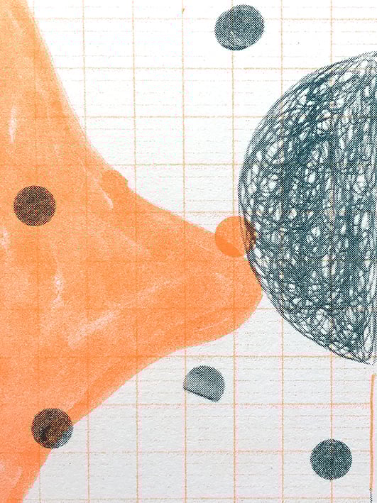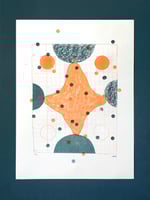 This on That (Orange and Teal) is the third of 3 new 2 colour prints playing with composition and testing the reproduction of collaged and drawn elements through the Risograph process.